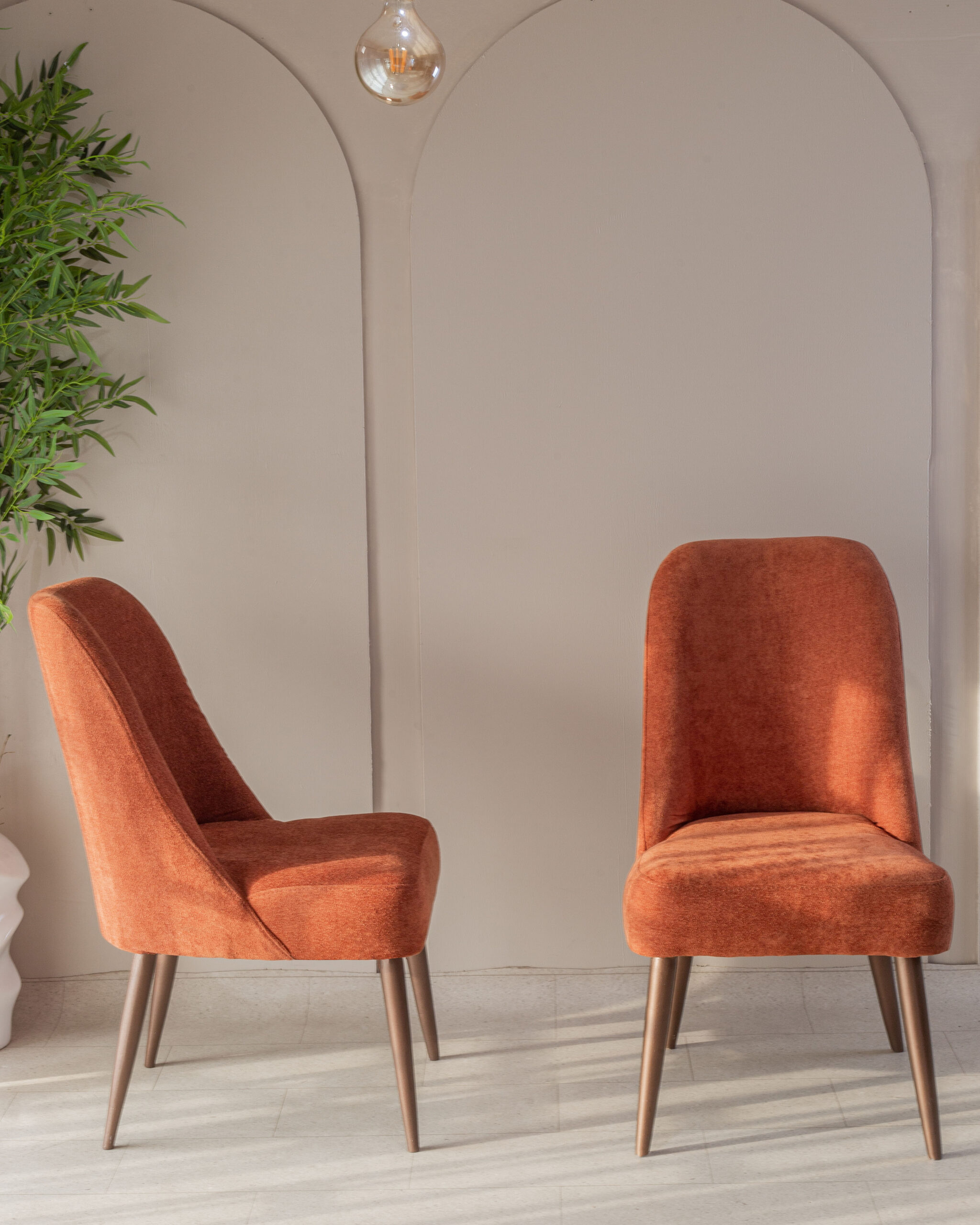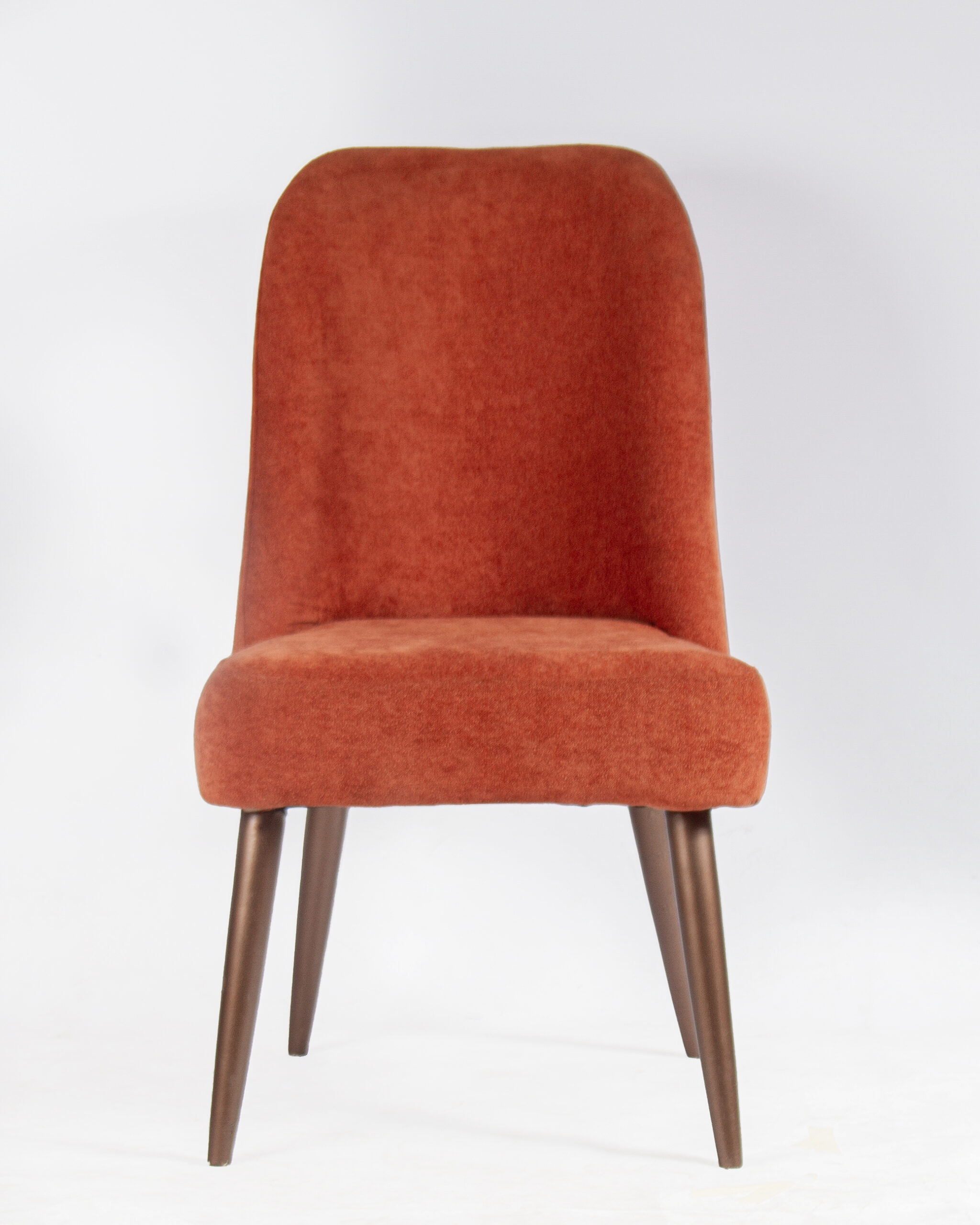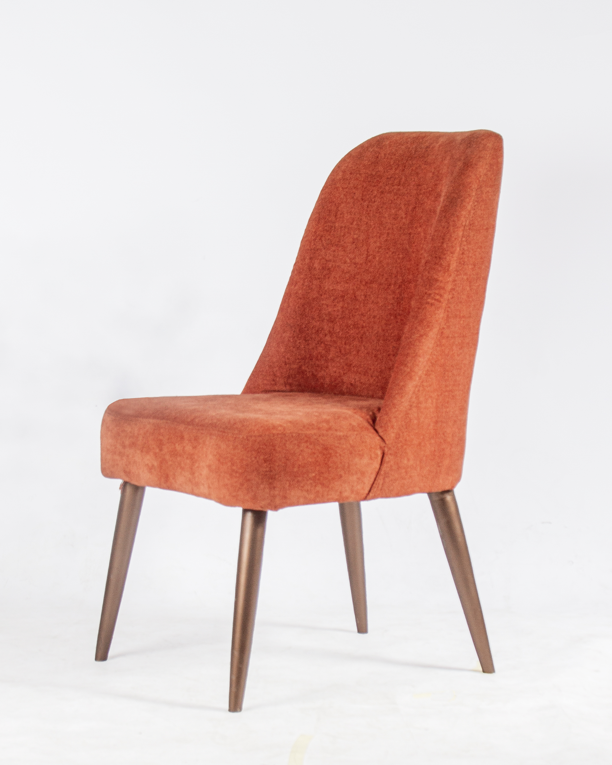 This sophisticated chair has a wide padded sitting area with a sloped-curved backrest to provide comfort. The conical wooden legs gives a unique and decorative essence to the bottom of the chair and the patterned fabric gives the chair a unique and radiant feel.
