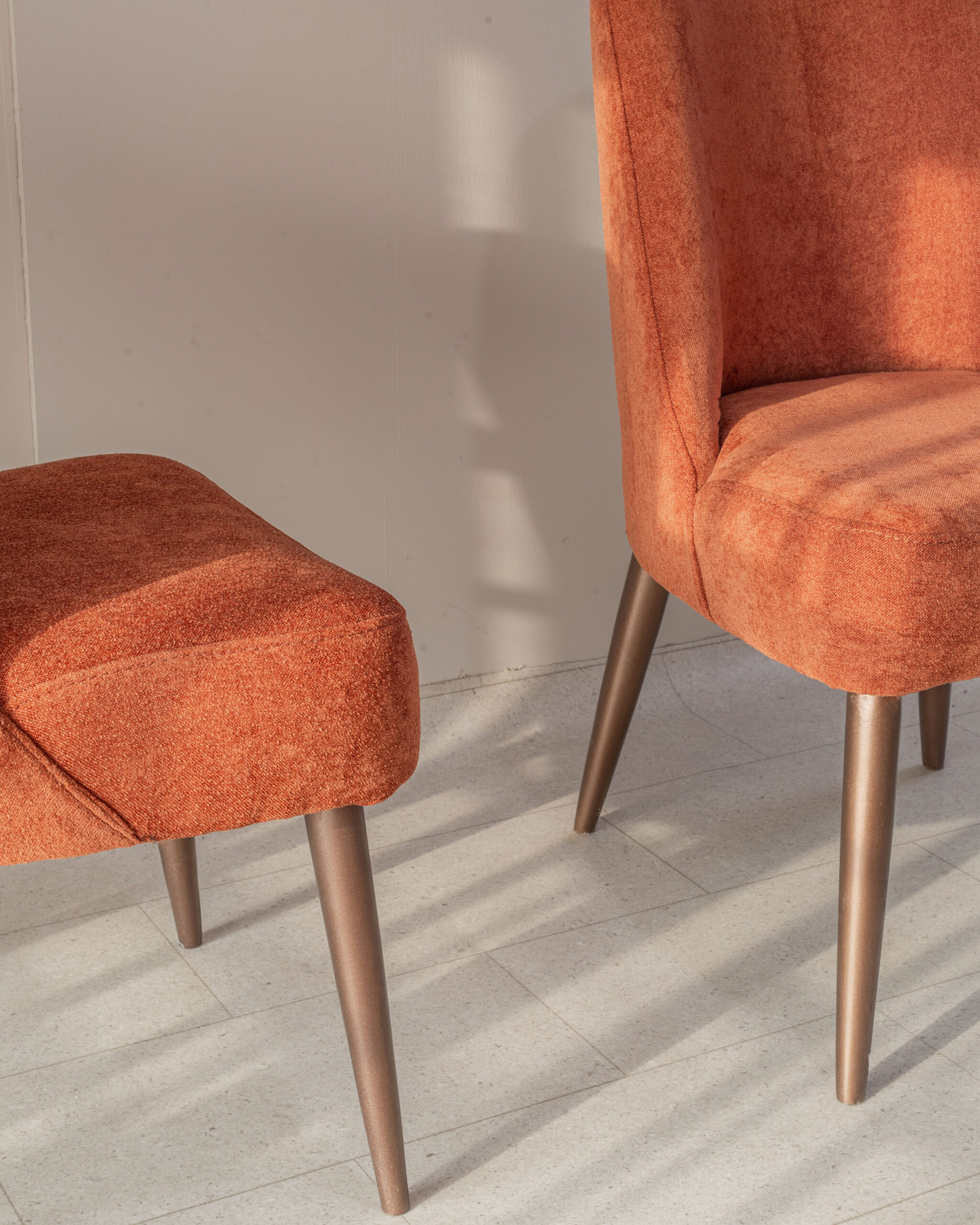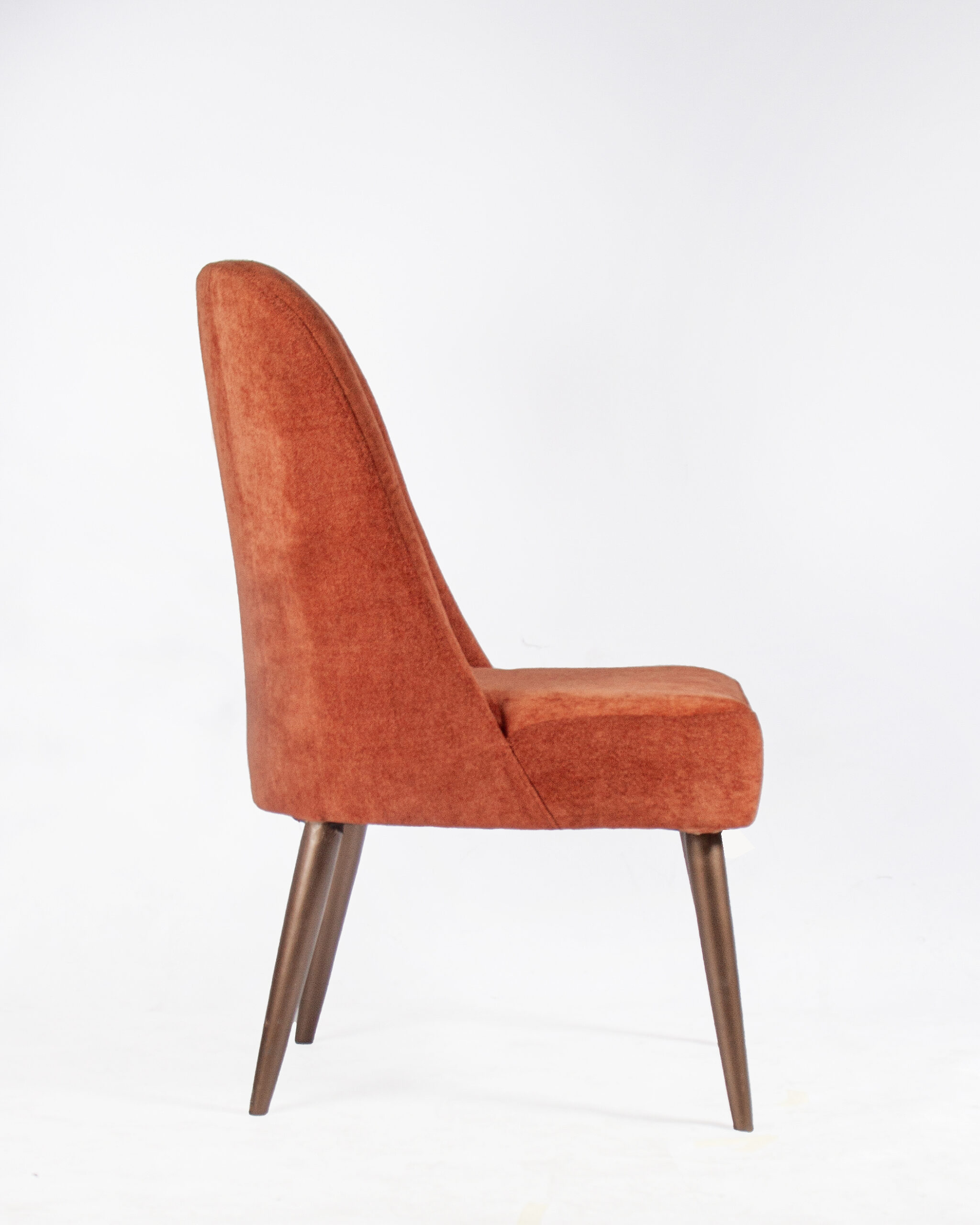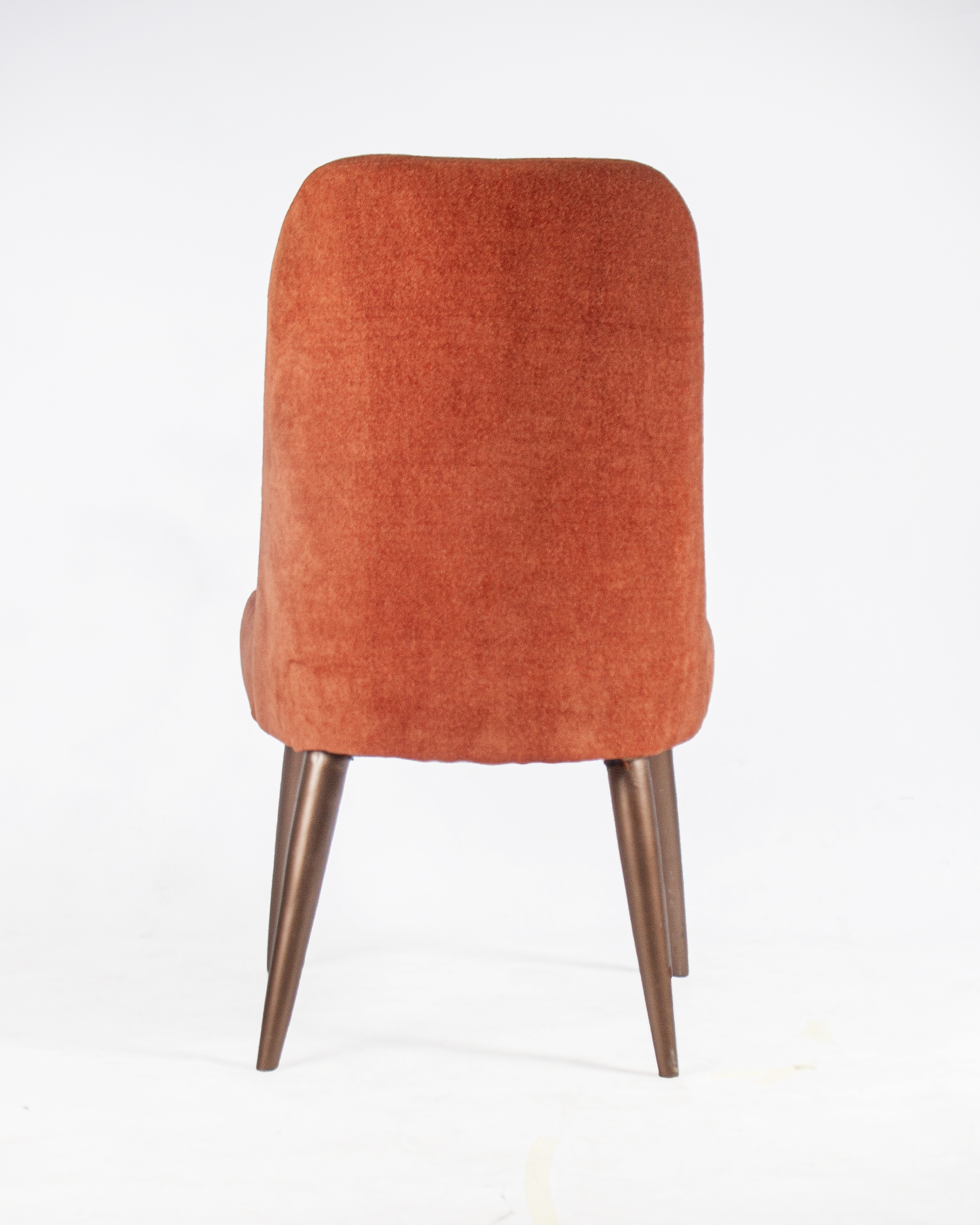 This sophisticated chair has a wide padded sitting area with a sloped-curved backrest to provide comfort. The conical wooden legs gives a unique and decorative essence to the bottom of the chair and the patterned fabric gives the chair a unique and radiant feel.