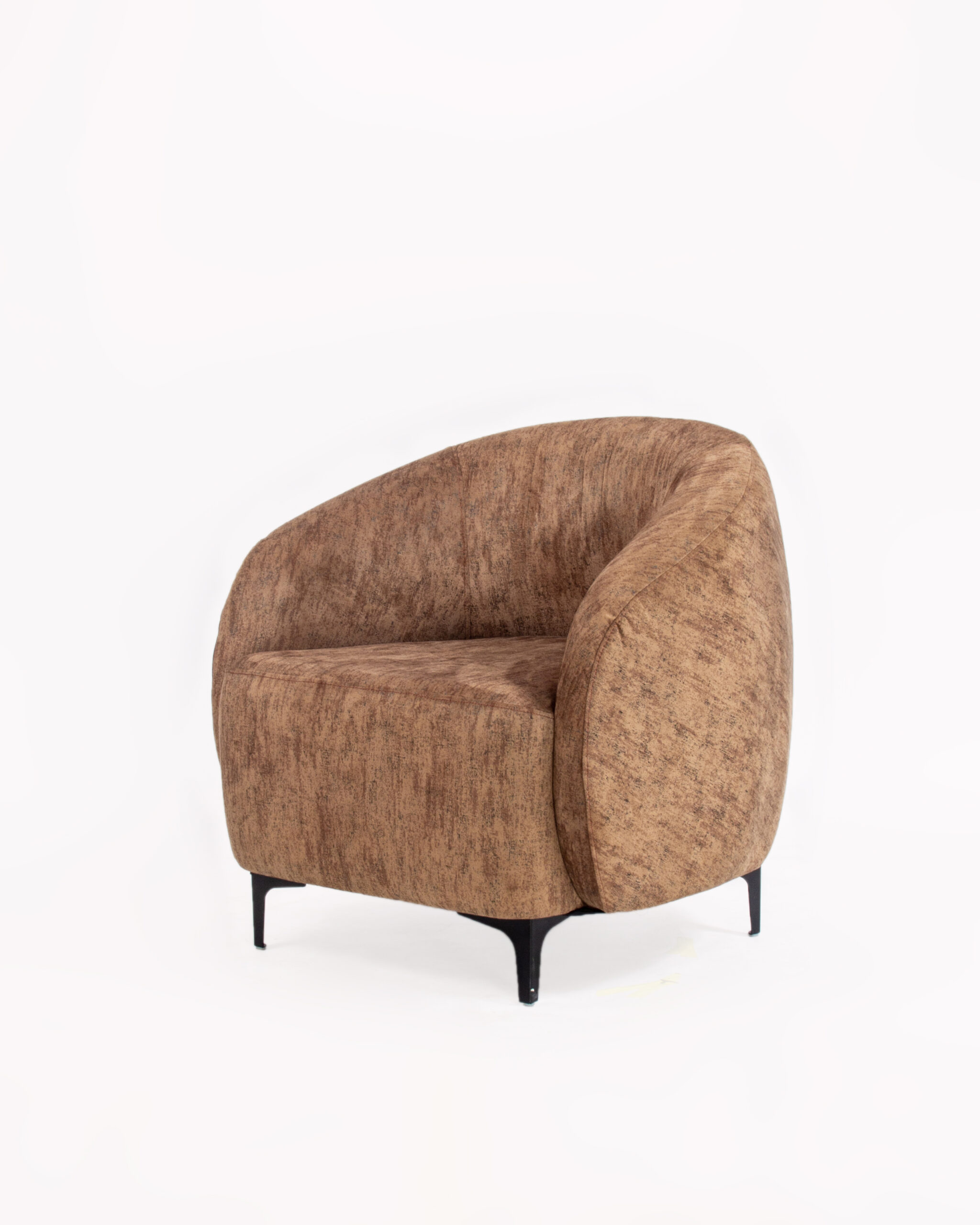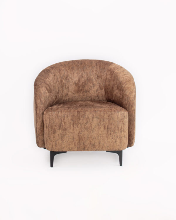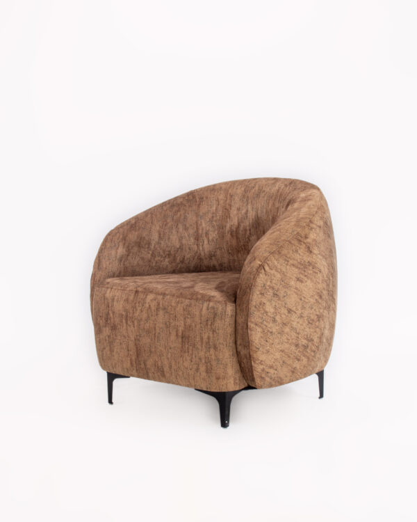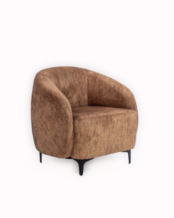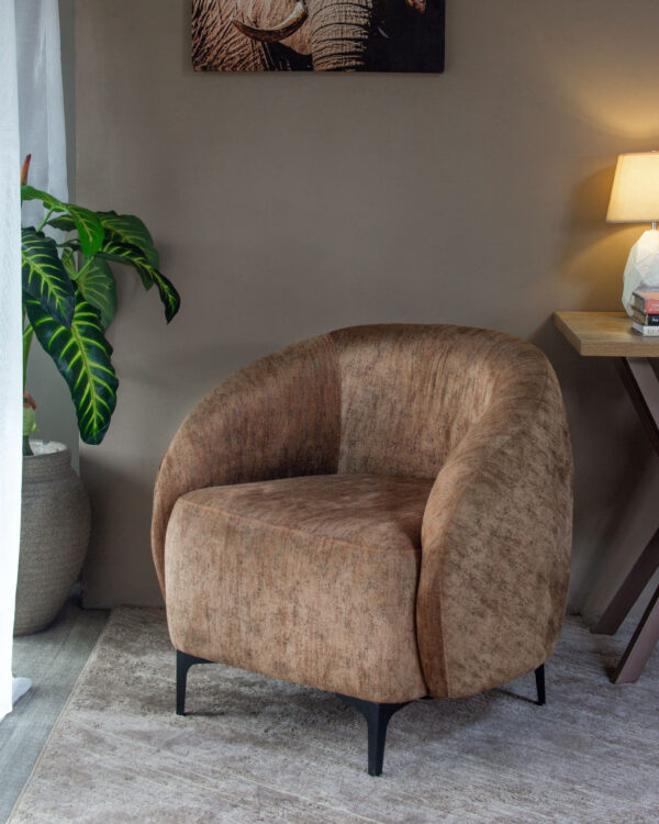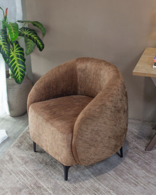 Upholstered in a rich, earth-toned fabric with a subtle textured sheen, this chair brings warmth and depth to any space. Its gently curved silhouette wraps around you in effortless comfort, while sleek black legs lend a modern, grounded touch.